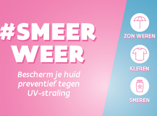 Onze Vlaamse regering trekt met de campagne “Smeerweer” de sensibilisering op gang. Het doel is dat meer en meer mensen gaan beseffen dat onze huid beschermen tegen de UV stralen nodig is. Velen weten dit al, maar het beschermen van onze huid doen we toch niet altijd voldoende. Naast het opzoeken van de schaduw en je huid beschermen door gepaste kledij is regelmatig zonnecrème smeren een goede manier je te beschermen. Te veel vergeten we dit nog tijdens een vlug terrasje, een korte uitstap of een speeltuinbezoek met de kinderen. Maar ook tijdens jeugdkampen, het sporten en op de speelplaats wordt er nog te lichtzinnig omgegaan met de nadelige gevolgen van de zon.