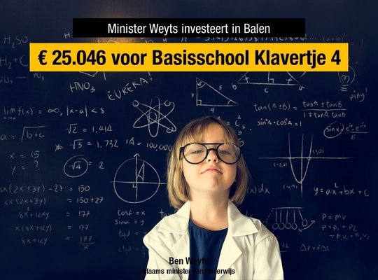 Vlaams minister van Onderwijs Ben Weyts (N-VA) investeert zo via het Agentschap voor Infrastructuur in het Onderwijs (AGION) € 25.046 in Vrije Basisschool - Klavertje 4 in Balen voor de nieuwbouw van de kleuterschool en omgevingswerken.